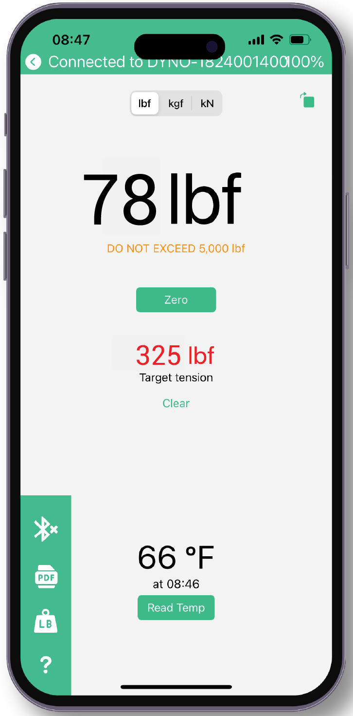 A dynamometer’s live tension measurement is displayed on the Vulcan Line Tools App